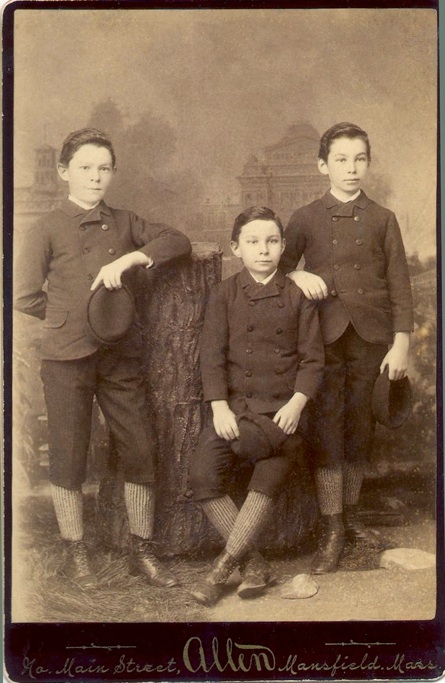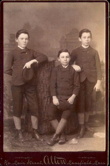 Following the birth of her first three sons, John, Murray and Allan, Isabella began having problems with hemorrhages (according to Uncle John), so she took the boys and went back to Scotland for a year. She was her parents’ only child and certainly would have wanted to take their only grandchildren back to get to know them. (The story I always heard was that she had gone home to die, but she was probably dying of homesickness—it would have been 10 years since she had seen her parents—and it was certainly a form of birth control!). Murray turned 7 on the way over (that would have been June 6, 1881) and 8 on the way back. John (born in 1873) was 1/1/2 years older, and Allan would have been about 3. The name of the ship on the way over was State of Georgia and the trip took ten days. They came back on the Scandinavian (see picture), and that trip took 14 days, complete with icebergs. They arrived back in Boston June 8, 1882. John was seasick over and back, but Murray and Allan were fine. They landed in and departed from Glasgow. Through letters from home they learned that there was such a severe winter in Massachusetts that while they were gone there was sleighing on Boston Harbor. Though John was young, he regularly wrote letters home. A photo of the boys ca. 1883 is shown below at left, L to R: Murray, Allan and John.