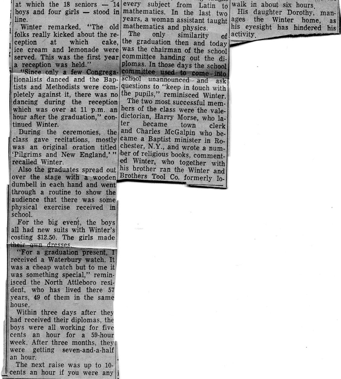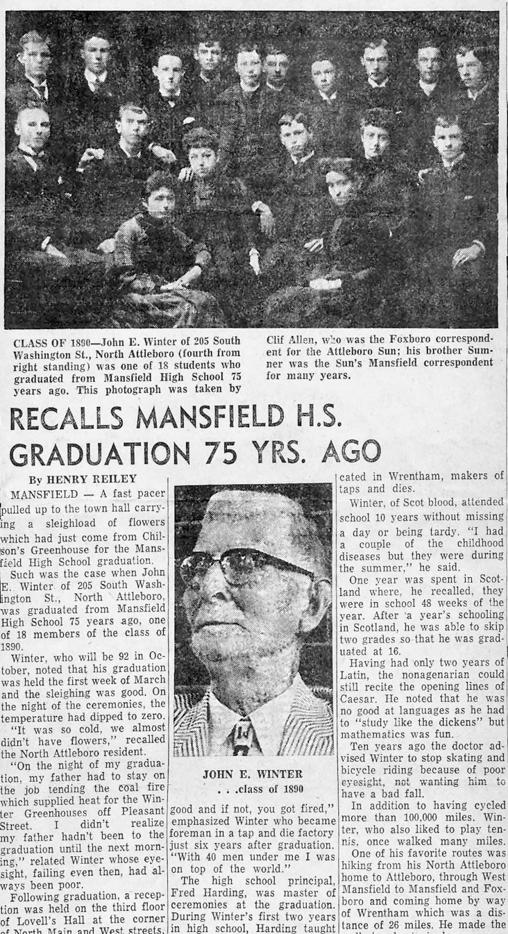In 1965, John Winter had lived in his house for 49 years and had lived in North Attleborough for 56 years. He was a great walker—walked to and from work in Wrentham, enjoyed using bicycles, motorcycles, electric cars, trains and buses. John had custom-made ice skates made for himself when he was 18 and skated until he was 82!