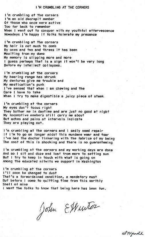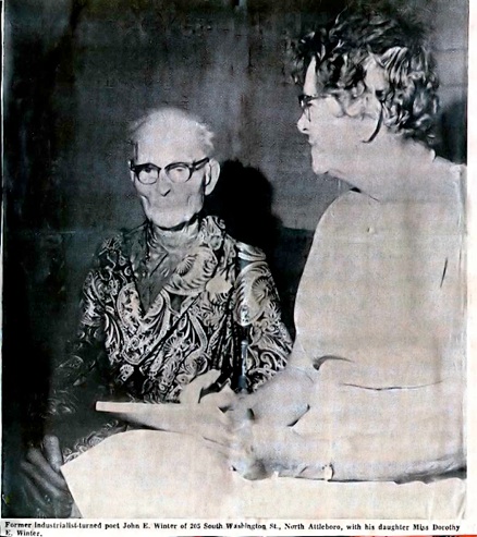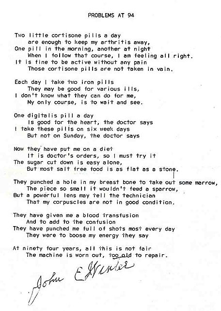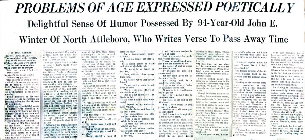 This excerpt is from a pessimistically humorous poem penned by John E. Winter of 205 South Washington St., one of several in which he describes the predicaments of his senior standing. Poetic comment on his own problems of age has become an amusing hobby for the 94-year-old gentleman.