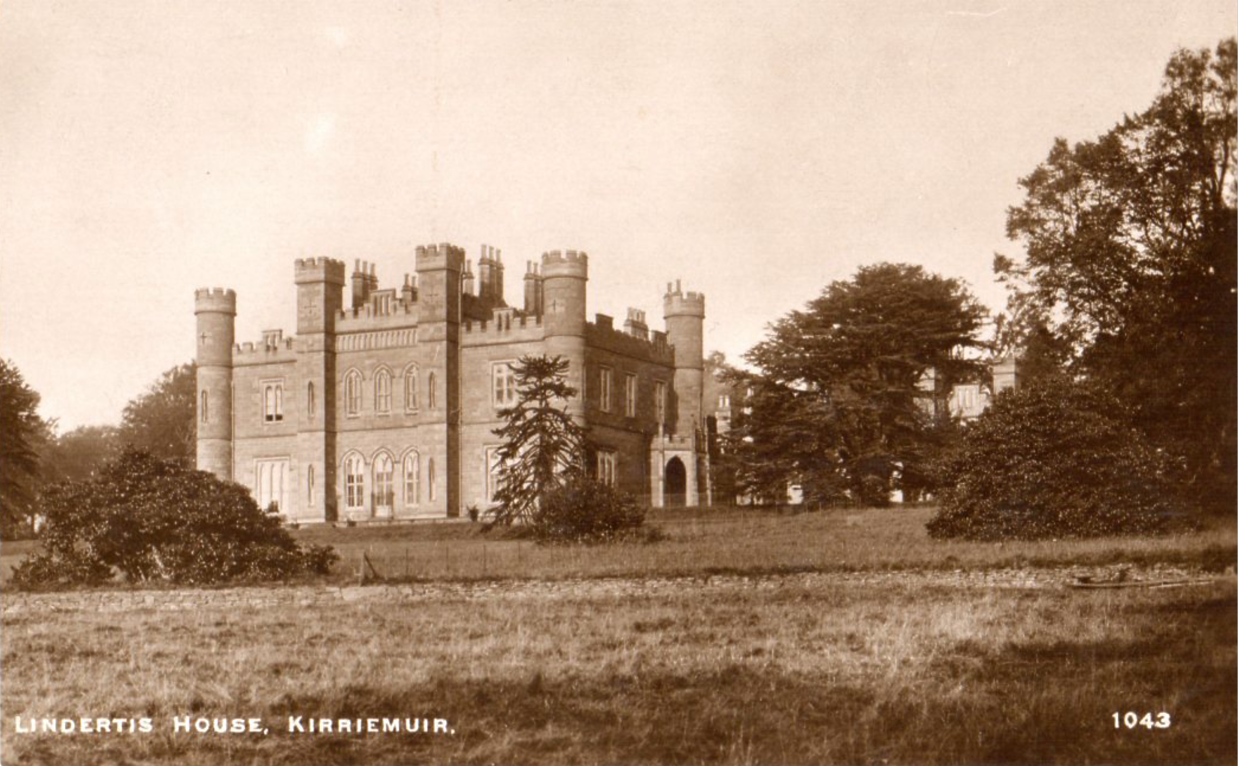 Again David Murie became interested in this baptismal record (which mentions birth but not baptisim.) and reseached Lindertis. He discovered that it was the location of a fine house, Lindertis House of Gilbert Laing Meason The house was totally rebuilt in 1813 and had elaborate gardens. David suggests that it was on this estate that James and Ann Winter lived when their first child, Janet and their second, James (1832-), was born in Meigle, about 8 miles from Lindertis. It is likely that the Lindertis estate was where James learned his horticultural skills. The owner of the Lindertis house died in 1832 and his son soon had financial difficulties and sold the house to creditors in 1838. While the house no longer exists, there are pictures. Below is a postcard photo.