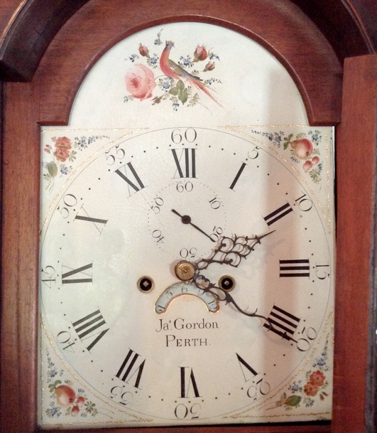 The trip back to the U.S. in 1871, following their marriage, enabled Patrick and Isabella to bring some valued family household items. Prominent among their baggage would have been the grandfather clock shown at left. Marion Winter Thomson said the clock belonged to Patrick and Isabella. The pictures were provided by Lowell Jr. and Marie Raymond who now own the clock. The Raymonds had the face of the clock professionally restored to its original condition. They have been faithful stewards of many items related to the Winter family. For more see the Winter Brothers memorabilia page. The clock was made by James Gordon of Perth who operated a shop in Perth from 1771-1796. (Information kindly provided by Colin Proudfoot, A. K. Bell Library, Perth.) Whether the clock belonged to the Winter family or the Ednie family is not known. Either way the clock would have likely been purchased used or if originally purchased, it would have been done so by James Winter, Ann Crane, John Ednie or Mary Allan’s parents. A silver service that belonged to the Ednies was also brought over and survives. The Raymonds also own an old Scottish Hymnal which belonged to Mary Ednie (see below.) To hear this 18th Century clock strike and click the small image of the clock below.