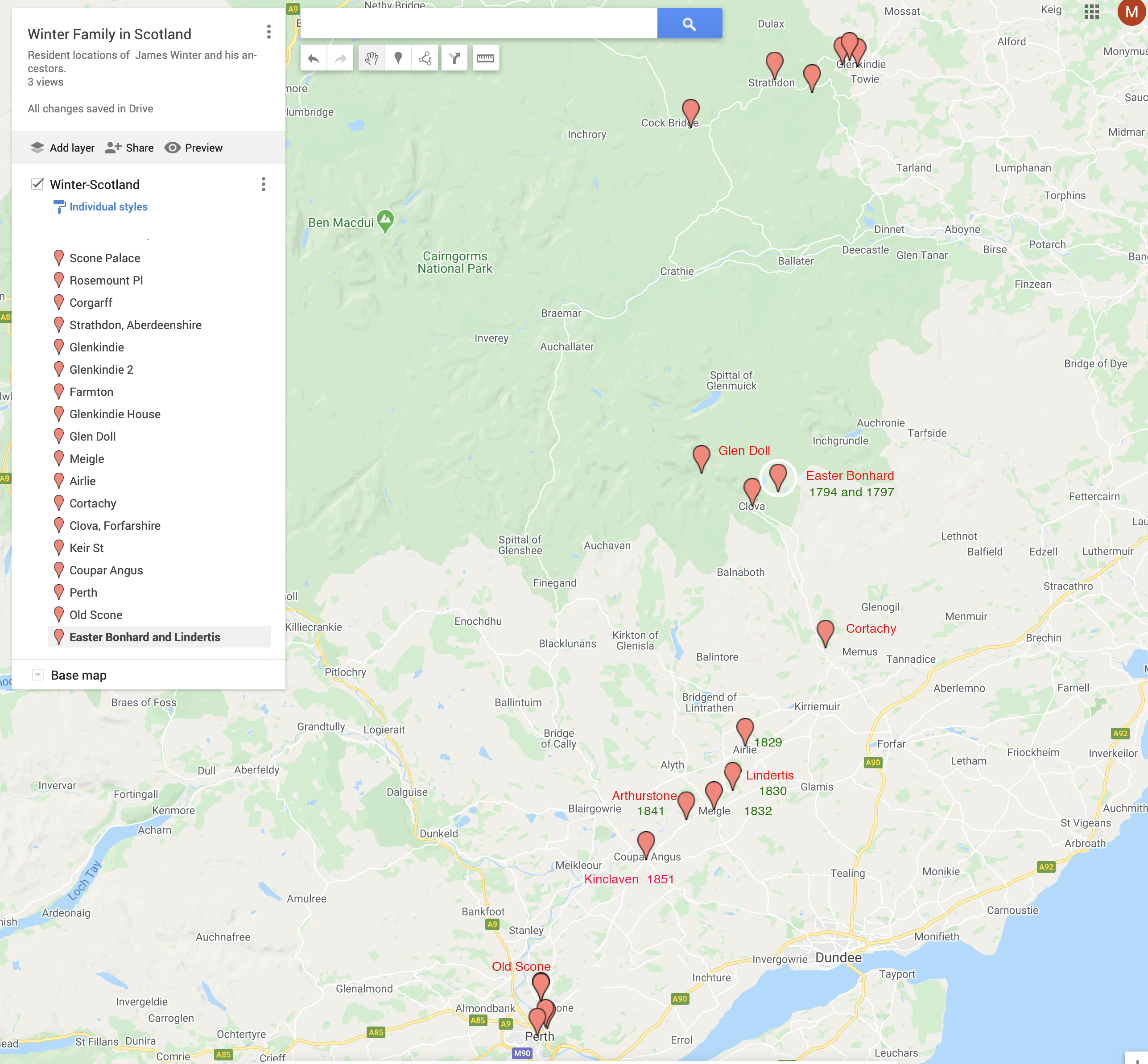 (click here for other Winter maps). James Scott's parents, Charles (b. 1768) and Jean Esplin (b. 1772) Winter lived in Bonhard. Parish records show an Alexander Winter living in Doll having a son Charles, probably James’ grandfather, born in 1731. Doll is in the River South Esk valley, just north of the village of Clova. There is a marker in the Kirkton of Clova remembering his sister, Janet, and her husband Alexander Robbie’s family.