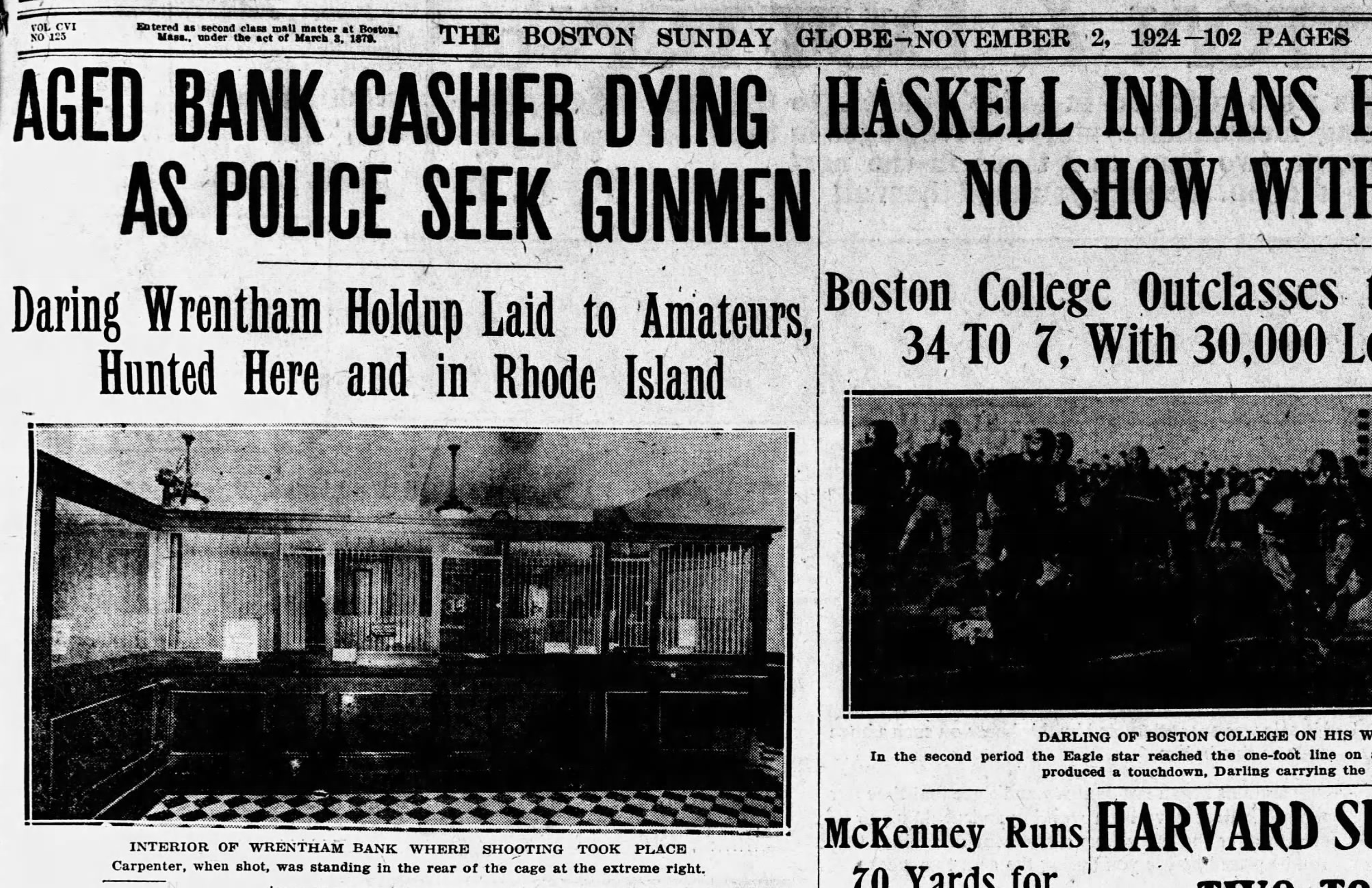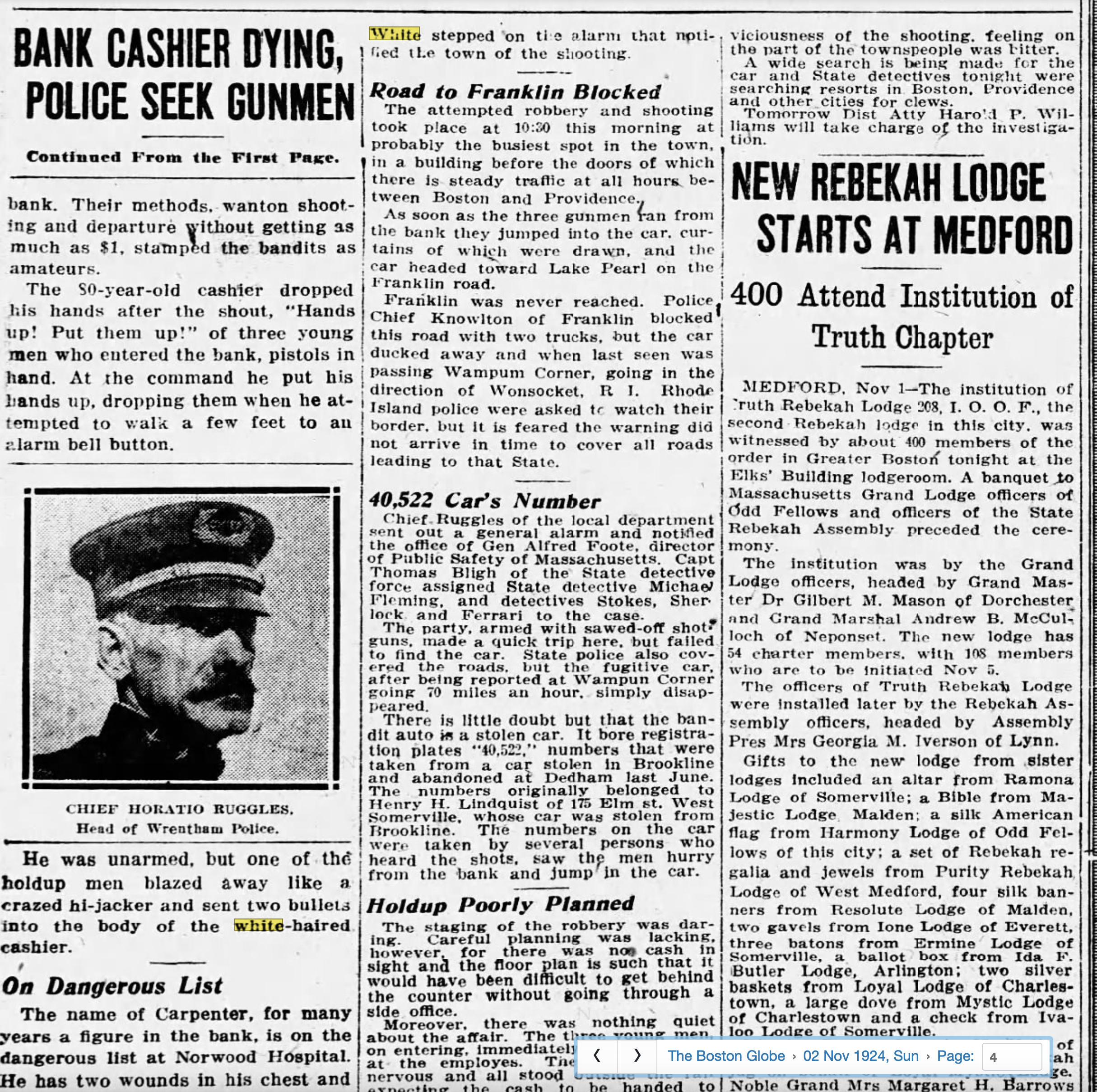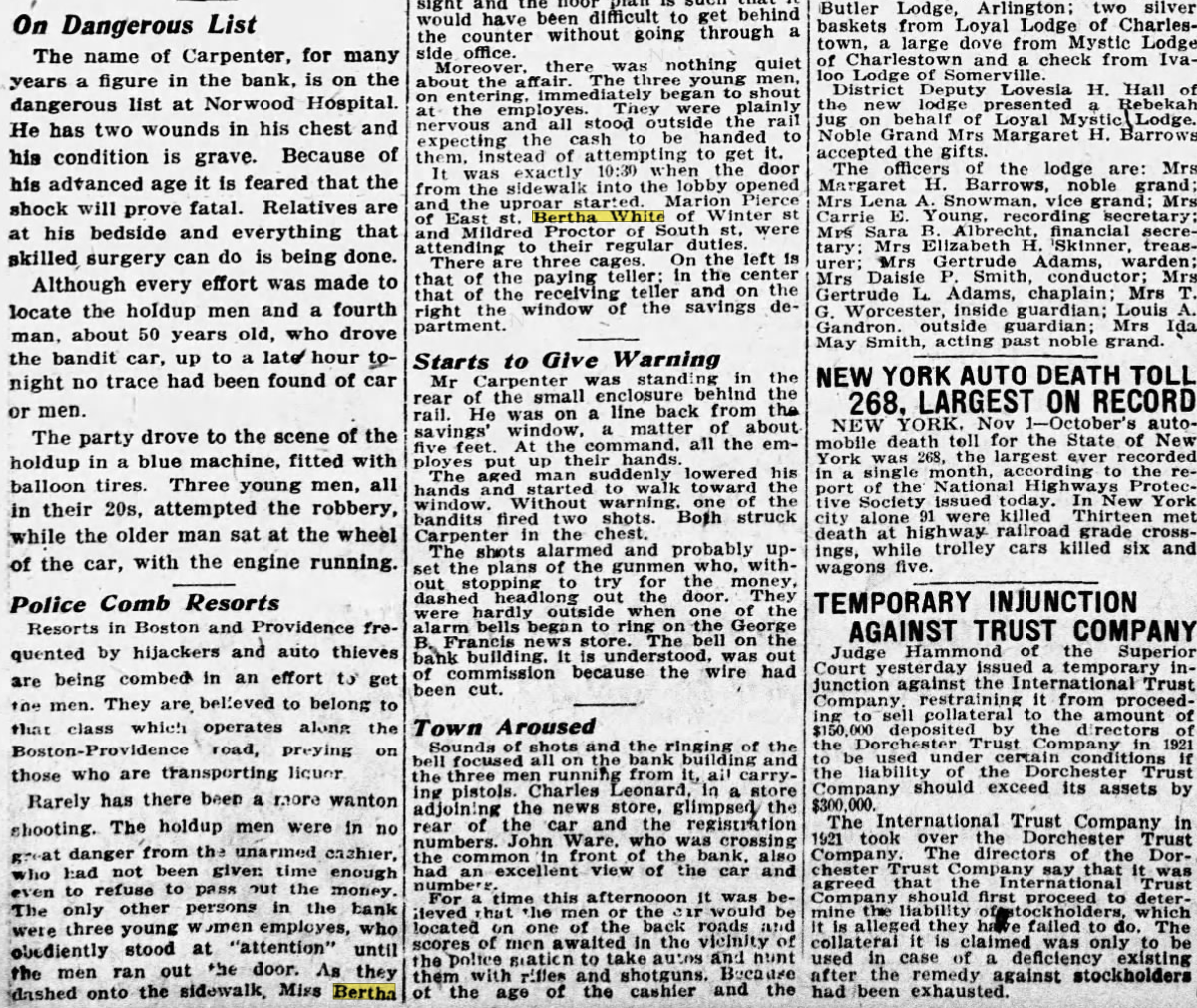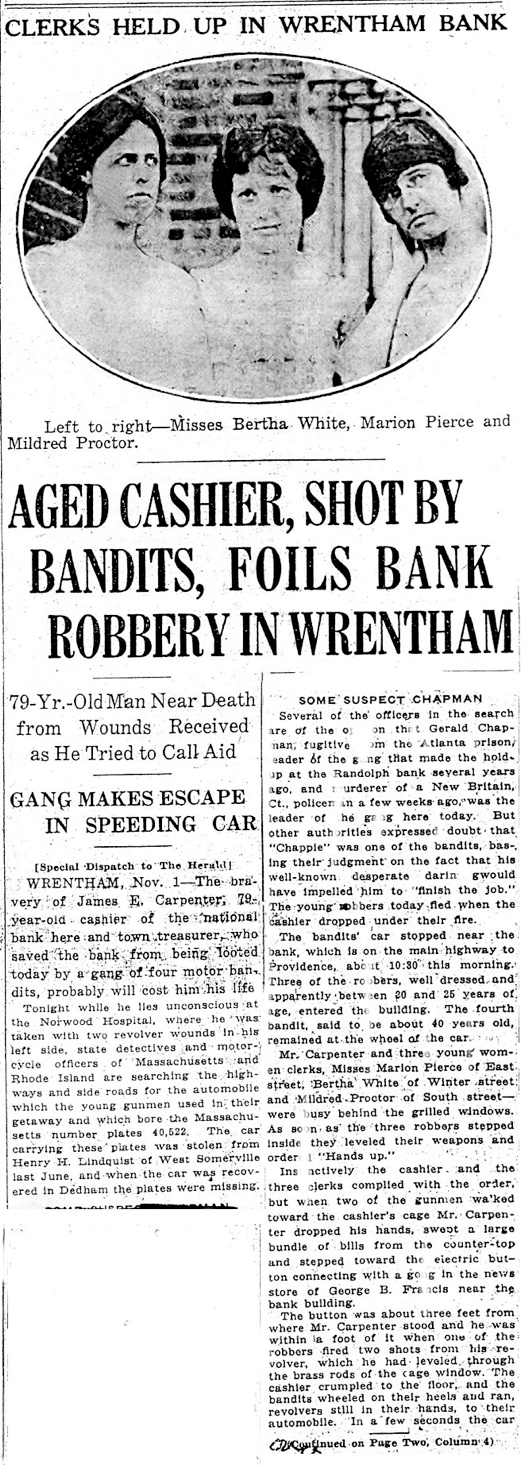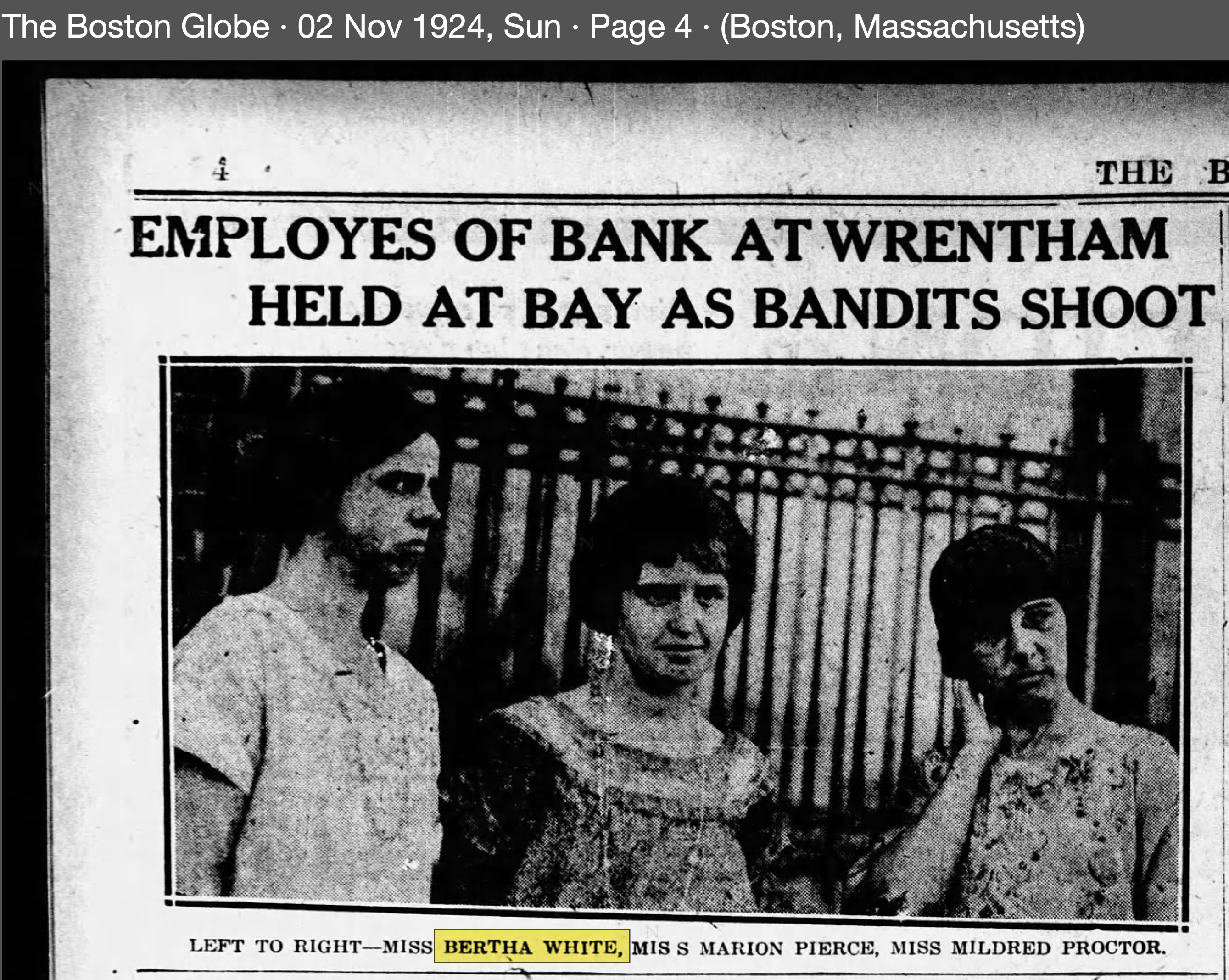 Bertha White, sister of Velma White Winter, worked for many years at the bank in Wrentham, MA. She was a dedicated employee and was present during the bank robbery reported below.