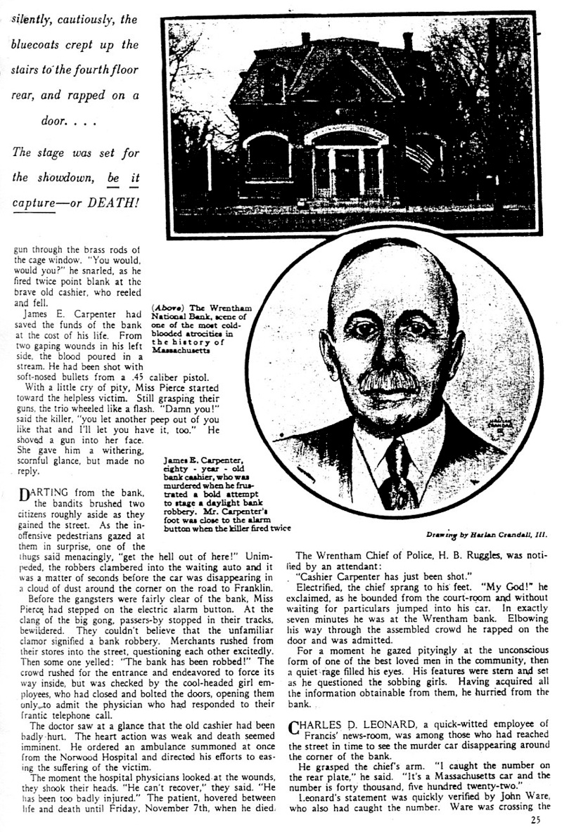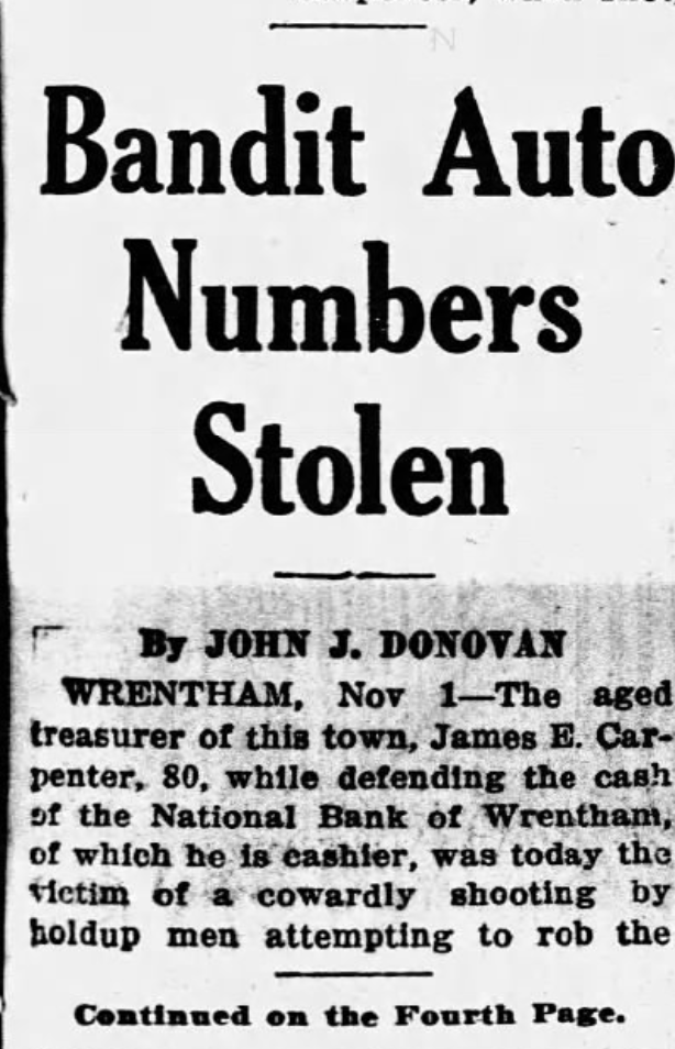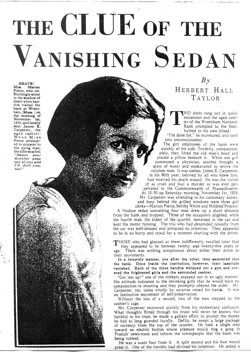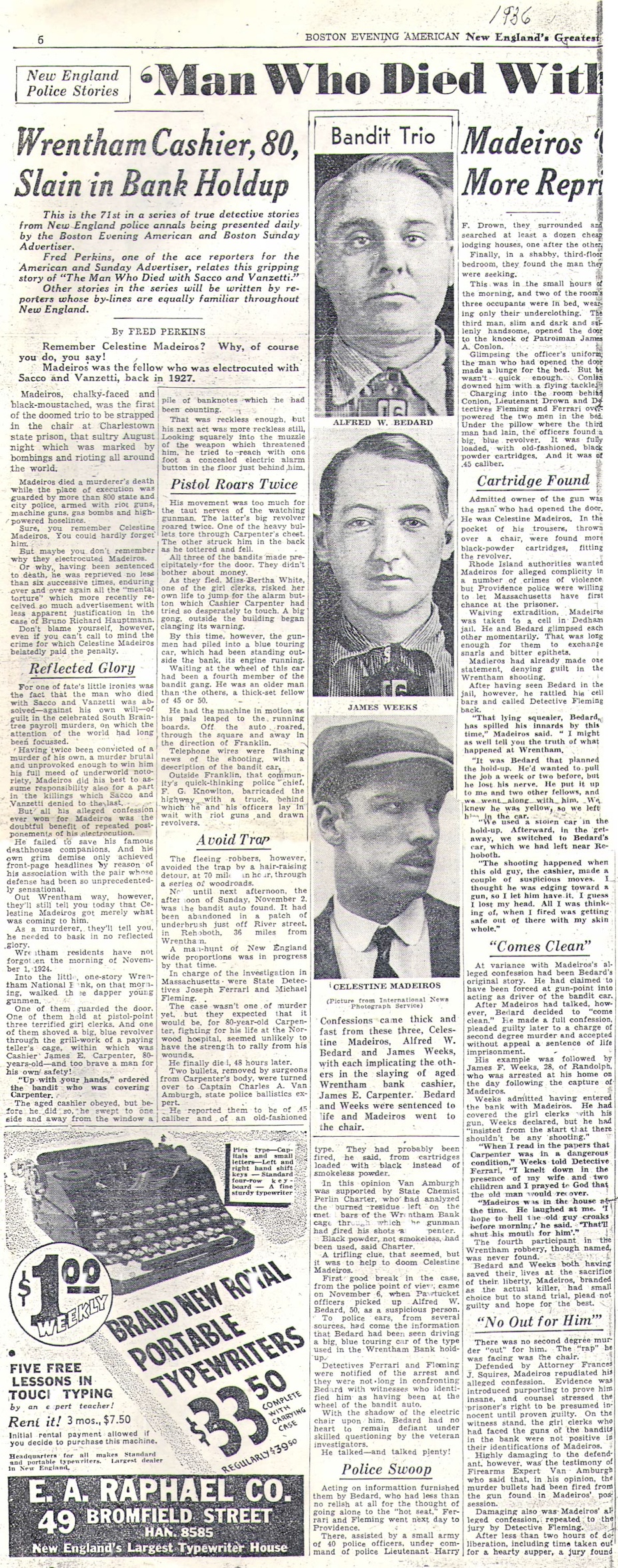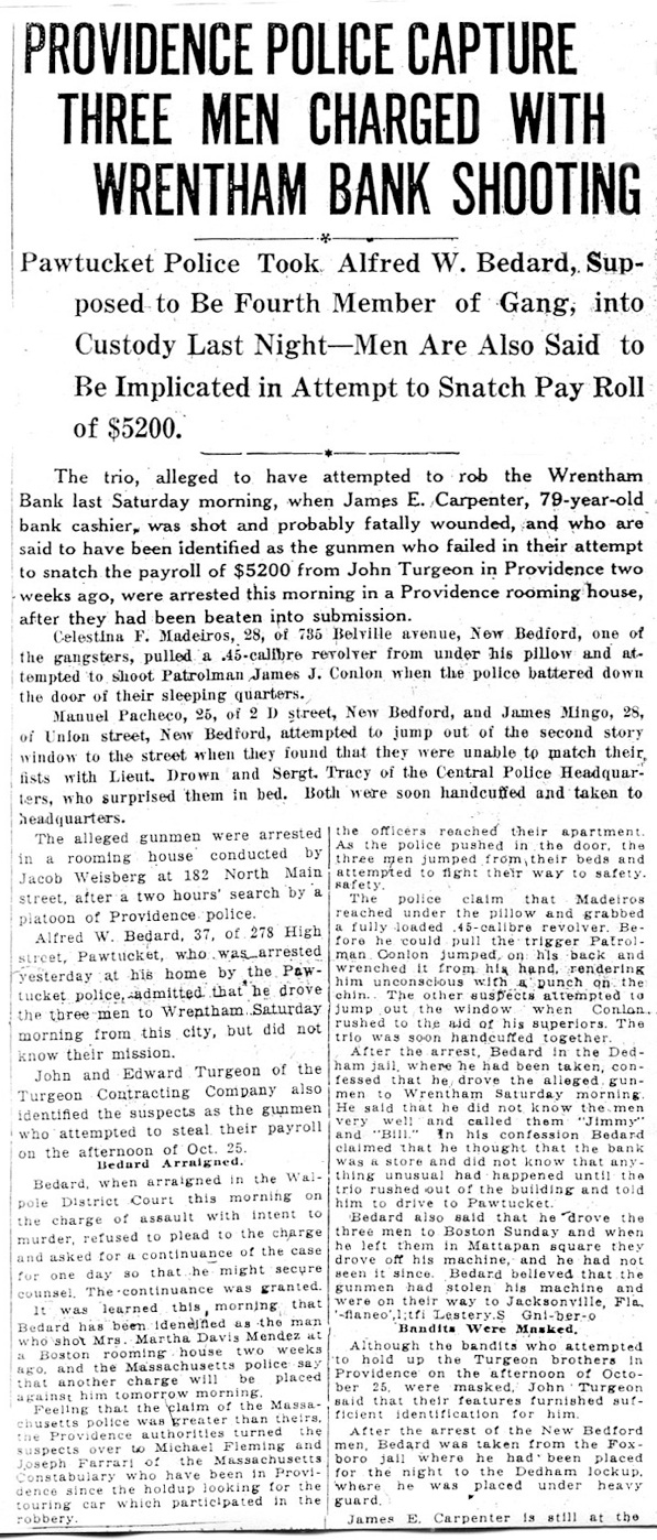 Bertha White, sister of Velma White Winter, worked for many years at the bank in Wrentham, MA. She was a dedicated employee and was present during the bank robbery reported below.