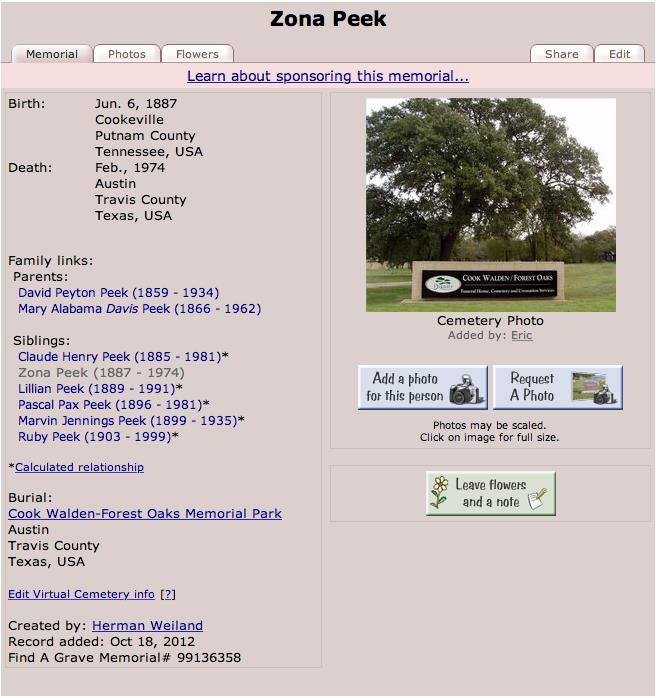 Sadly she appears not to have had children; she did not marry, her death certificate (Austin Texas, on 23 Feb 1974 aged 86; she was born on 6 June 1887) shows her full name of Lora Alzona Peek and was registered by her sister Lillian Peek.