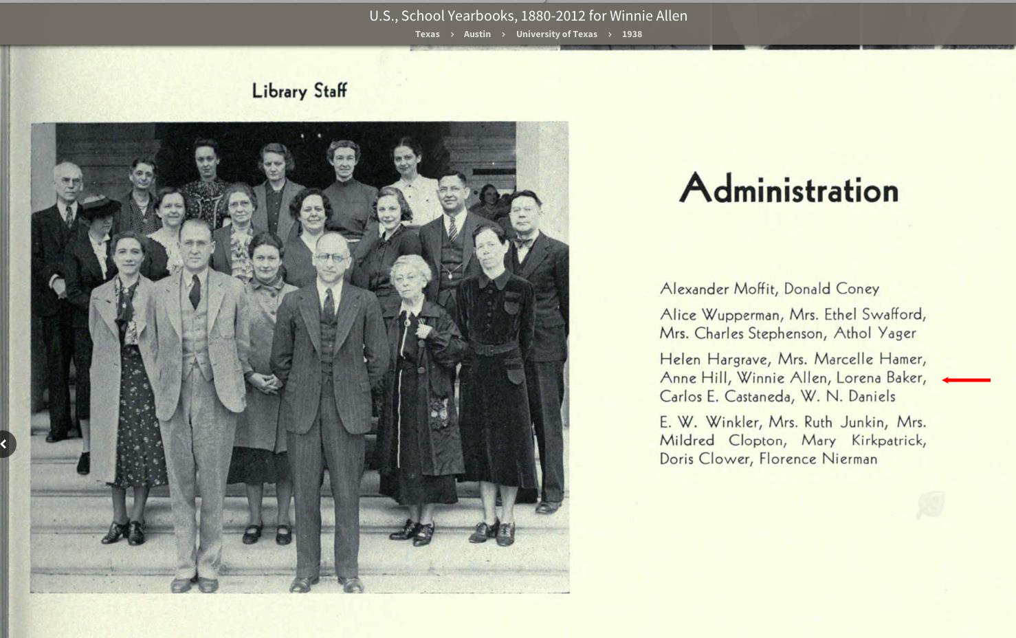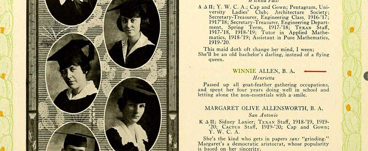"Miss Winnie Allen was a native of Henrietta, where she graduated from high school in 1917. She went on to the University of Texas, interrupting her academic career several times to teach school, and received her master’s degree in 1925. She immediately went to work as an assistant in the University of Texas Archives, which at that time consisted of the Stephen F. Austin papers and about twenty other collections, mostly Spanish documents relating to the history of Texas. In 1936 she became the chief archivist, a position she held for thirty-five years. She built the University of Texas Archives into one of the major depositories in the United States for material relating to the history of the Southwest; when she retired in 1960 it contained about 4,000 collections.