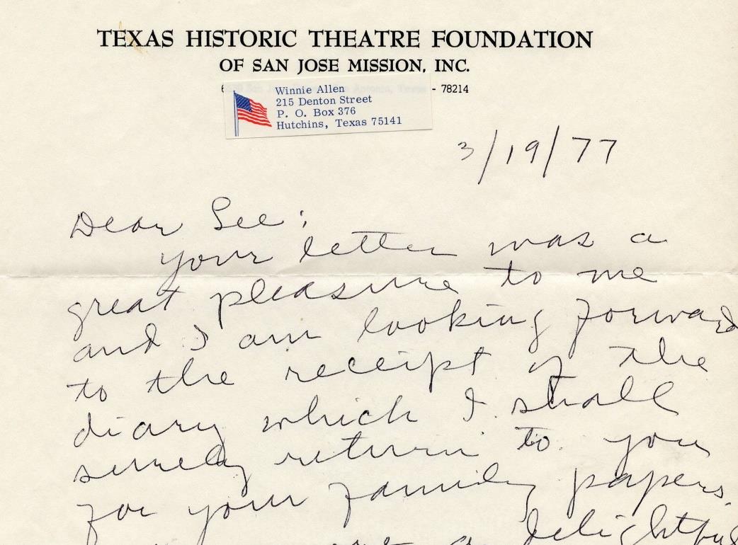 It is of course possible that she married after this, but she still styled herself 'Winnie Allen' in 1977, in a holograph letter (from 215 Denton Street, PO Box 376, Hutchins, Texas 75141) enclosed in the original Zowinajo book: