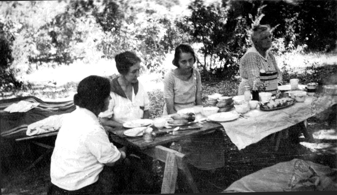 The reverse of the photo is annotated: "Wimberley Camp. Winnie [Allen] Lena [Megee] Lin [Thomas] Mrs Megee (my grandmother - MLW)" - the square brackets are part of the text11. The photo is undated, but one might guess that it is before the 1921 trip12, but perhaps not by much.
